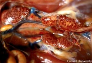 – رشد غیر طبیعی اویدوکت و کیستیک شدن آن در اثر ابتلای جوجه های جوان به بیماری