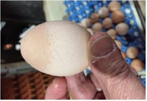 – پوسته تخم مرغ در مرغان مبتلا در ناحیه راس ( ناحیه باریک تخم مرغ) نازک و متخلخل می گردد.